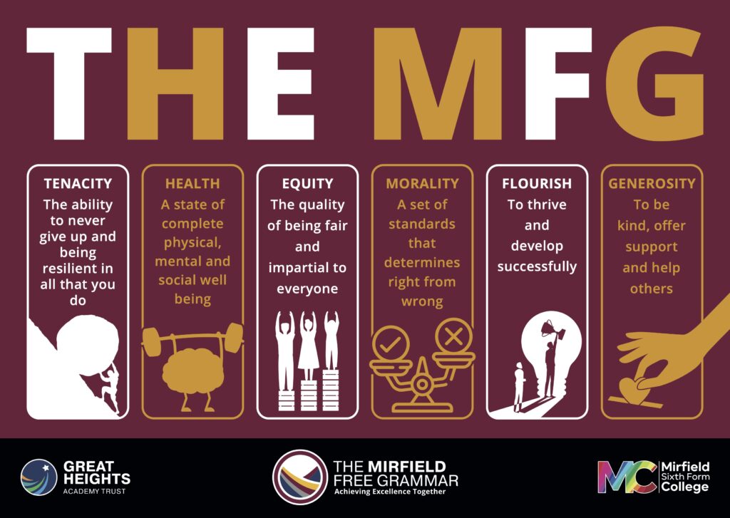 The MFG Character is based on the six pillars of Tenacity, Health, Equity, Morality, Flourish, Generosity. It has been designed to help students develop key character traits that will build confidence and self-belief, a sound moral compass and respect for others.