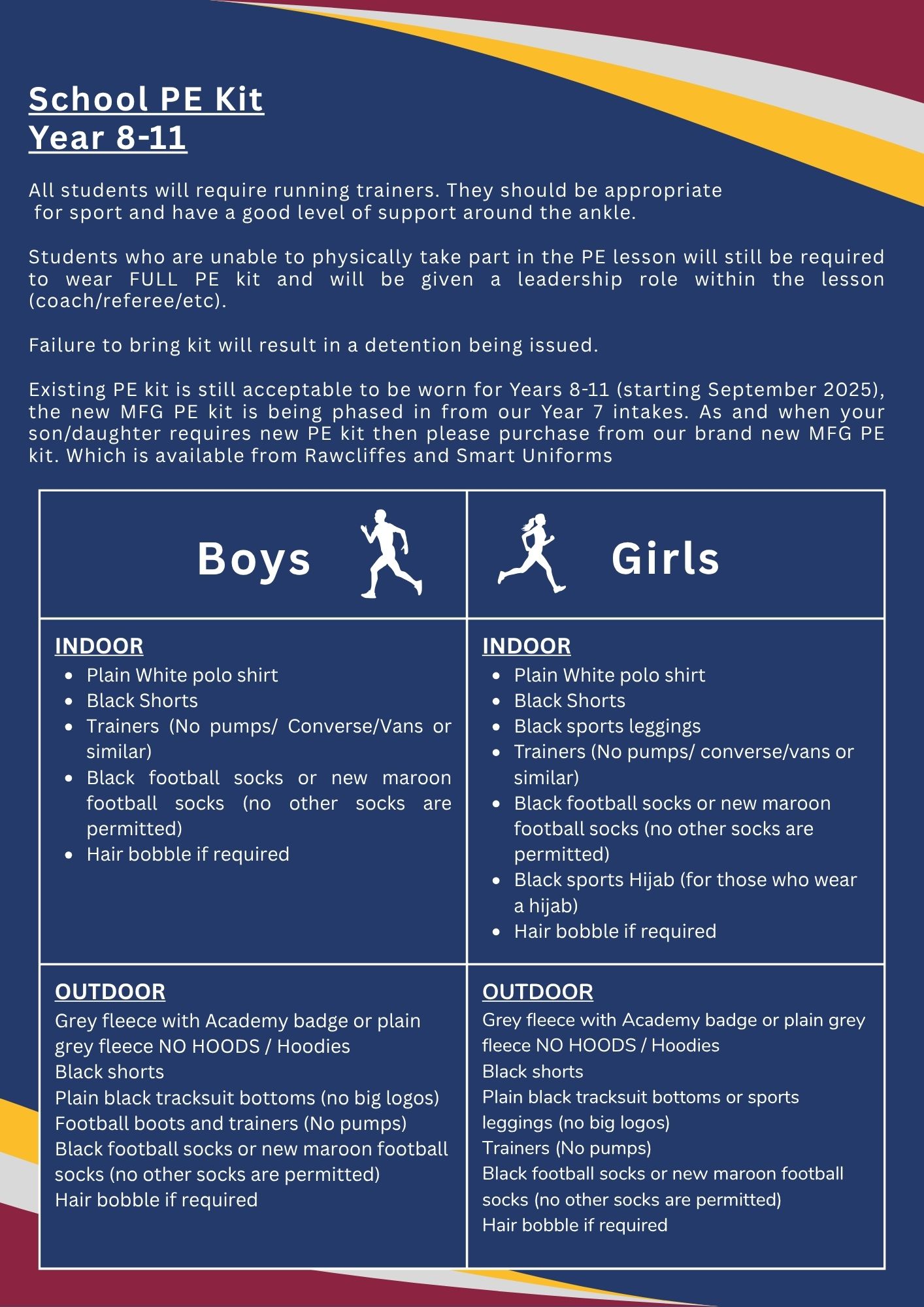 We believe that high standards of dress are important for students as individuals and the Academy as a whole. Our uniform has been chosen because it represents the clearly identifiable standard for The MFG. It is straightforward and smart. It is compulsory for all students, and parents are asked to support the staff in monitoring their child’s dress. The wearing of items of clothing relating to religious beliefs is acceptable, so long as they are in Academy colours.