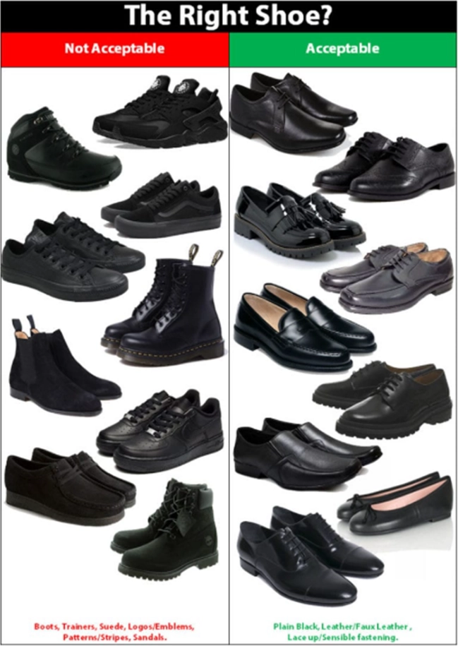 - Footwear – shoes (not trainers) should be plain black and either flat soles or with a conventional low heel (5cm max). Backless shoes, high heels and boots and leisure or leisure-looking shoes are not acceptable (see below)