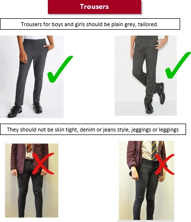 - Mid-grey tailored trousers, not black or tight fitting (see below)